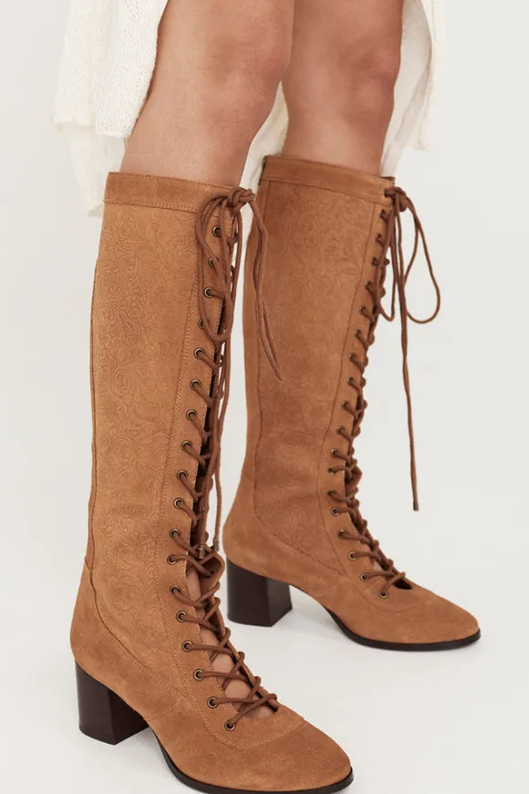Our Clair De Lune Lace Up Boots in Toffee are made for the rebel hearts. Nostalgic for the 70’s, our boots are bold and dripping with bohemian allure. Our boots feature an eye-catching open front (no tongue) with laces to the top hem and a stunning custom debossed detail at the side panels.
