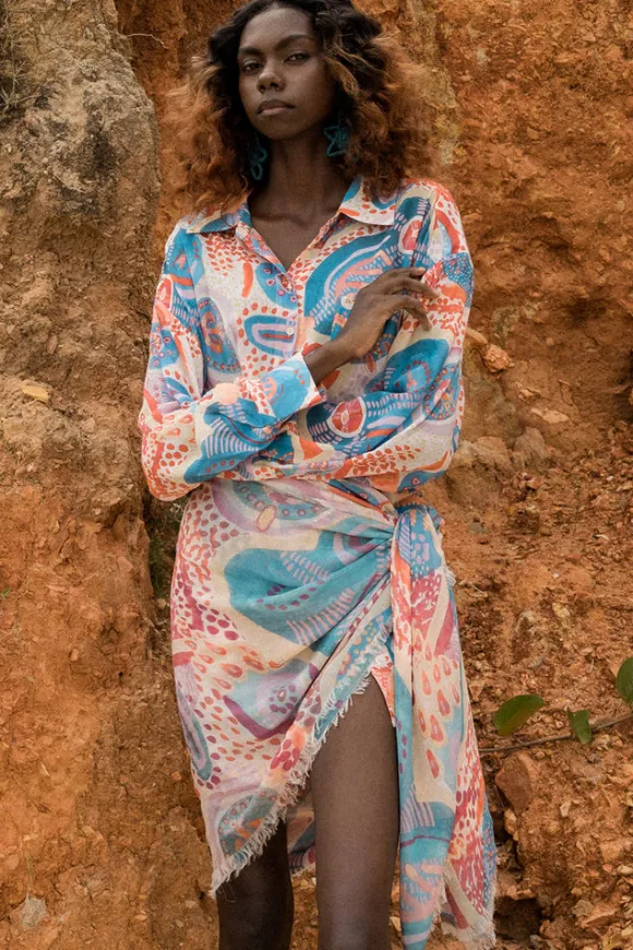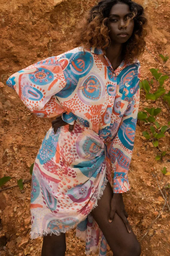 Our Evelyn Travel Scarf in Bay Blue is the perfect accessory for all adventures. Our newest Travel Scarf is incredibly unique featuring a hand painted watercolour artwork by First Nations artist – Kylie Caldwell. Our usual Travel Scarf shape, this one is endlessly versatile. Wear this one as a skirt or sarong for easy beach to bar styling, get creative and rock this as a headpiece or as a wrap or halter top. So soft to the touch, our newest scarf makes the perfect gift for yourself or for someone you love. – Crafted from super soft 100% LENZING™ Modal
