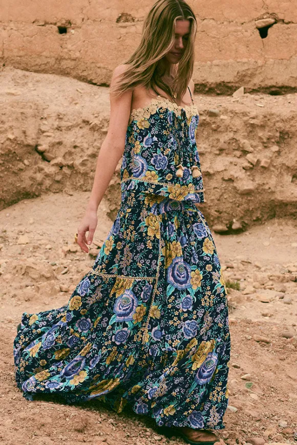 The Full Bloom Maxi Skirt in Periwinkle is a nostalgic nod to vintage femininity. Designed in a flowing silhouette, this beauty features an allover floral print, a front yoke panel, and a shirred elastic waist for the perfect fit. Delicate faggoting lace trims and a soft hem frill add a touch of romance, making this skirt effortlessly dreamy. Pair it with the Full Bloom Cami for a matching set or style it with a vintage tee for a carefree, bohemian vibe.