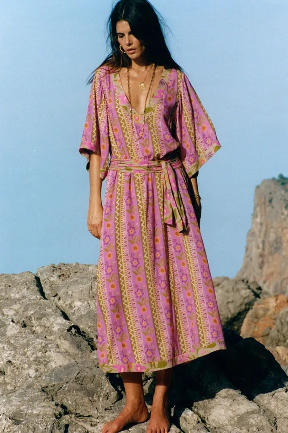 The Goldie Gown in Desert Rose is a statement of effortless elegance, infused with vintage charm. Crafted from soft, sustainable LENZING™ ECOVERO™ Viscose, this flowing silhouette features an allover print with contrast detailing at the neckline, cuffs, and hem for a striking finish. A deep V-neckline and elbow-length sleeves add a touch of femininity, while side hem splits create graceful movement with every step. Timeless yet modern, this beauty is destined to be a wardrobe favorite.