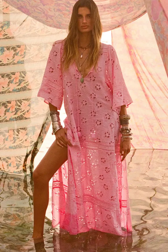 Step into a daydream with the Love Note Broderie Gown in Cosmos Pink, a gown that speaks of romance and delicate femininity. The soft pink hue, combined with custom embroidery and lace, lends an air of whimsy and beauty. A V-neckline with a keyhole opening at the centre front and side splits create a graceful, flowing silhouette, while flutter sleeves add a touch of fairytale magic. Tassel-tipped ties with shimmering threads complete the look, while the custom scalloped hem adds a finishing touch, making this gown a cherished piece for any dreamy occasion.