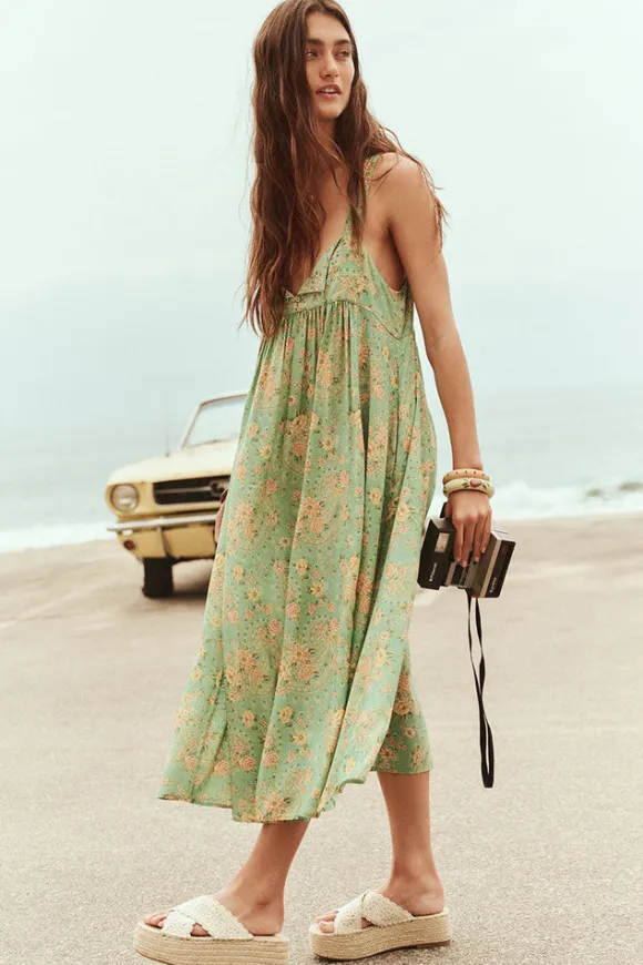 Our Melody Strappy House Dress in Arizona evokes the freedom and beauty of the desert in bloom, gold and peachy wildflowers sprawl across a green backdrop and patterns collide in a kaleidoscope of patchwork prints. Delicate gathers from the waist, handmade tassel neck ties with custom charms are effortless and feminine. The bohemian dress of our dreams, this one pairs best with cowboy boots and layered accessories to complete the look or with tan mules and fine jewels for cocktails on a sundrenched balcony in summer air.