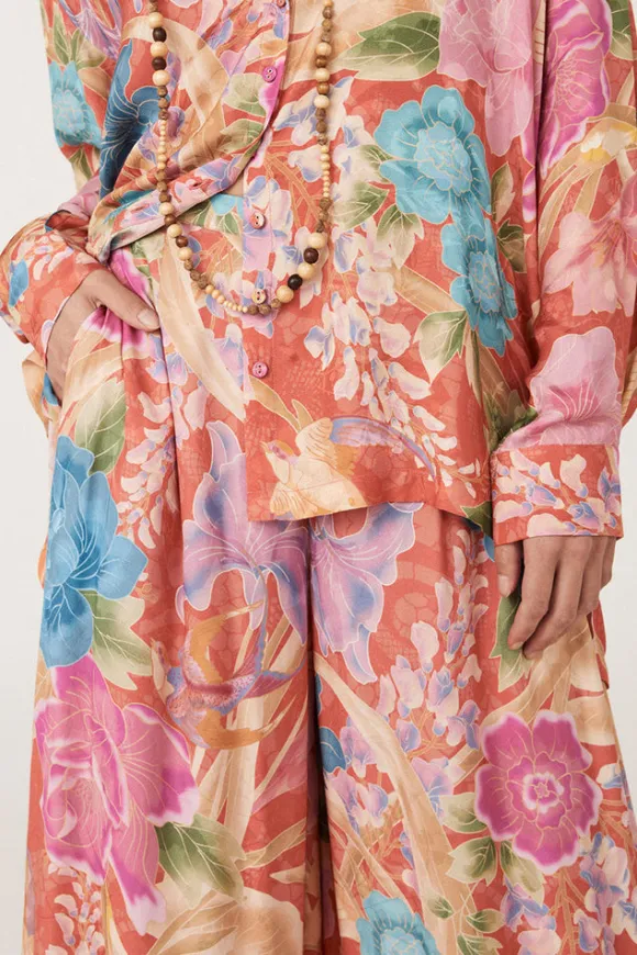 The Painter’s Garden Wide Leg Pant in Crimson exudes sophistication and luxury with a dramatic wide leg and vibrant painterly florals reminiscent of a watercolour garden in full bloom. Our pants are crafted with liquid silk like fabric and include a hidden jacquard print that reveals itself in sunlight, enchanting with every step. Add a skivvy and boots for the cooler months or a white cami and a strappy sandal for warmer days. Match our pants with the Painter’s Garden Shirt for maximum impact at your next soirée. Our pants offer timeless elegance no matter the occasion!