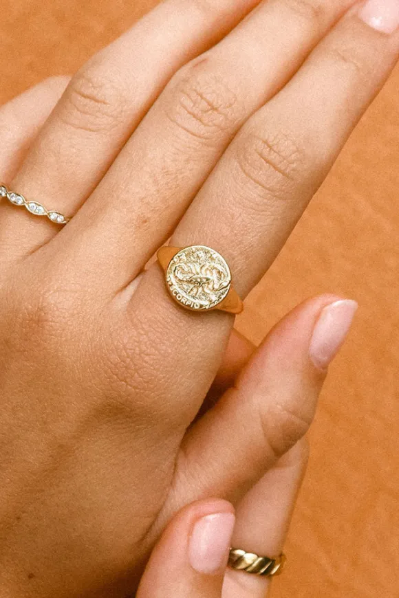 The Scorpio Zodiac Ring features a personalised embossed artwork that is inspired by the unique characteristics of the Scorpio woman. These beautiful keepsakes are hand crafted by WTFO Artisan Groups and shine in our statement 22k Gold Vermeil and 0.925 Sterling Silver. Wear on their own or pair with any combination of your fave jewels.