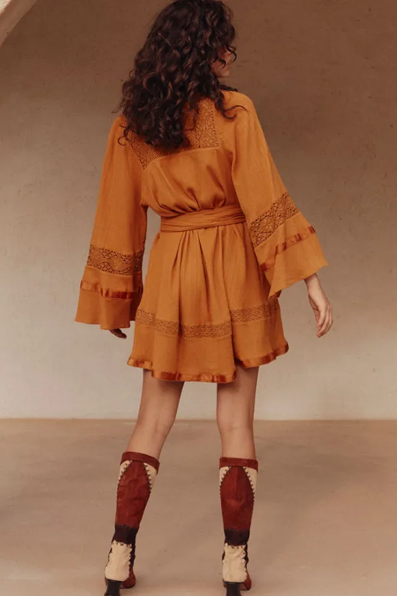 The Serenade Tunic Dress in Marigold radiates effortless boho charm with a touch of vintage-inspired elegance. Crafted from 100% organic cotton, the crinkle-textured fabric adds depth and movement to this beautiful piece. With raglan sleeves and a flattering square neckline, this tunic dress offers a relaxed fit that’s both chic and comfortable. The lace yoke at the back adds an element of surprise, with delicate gathers creating a feminine touch. Functional self-fabric covered buttons run from neck to hem, while hand-twisted ties with gold-threaded tassels bring a touch of artisan craftsmanship. Pair with sandals or boots and let this stunning dress take center stage.