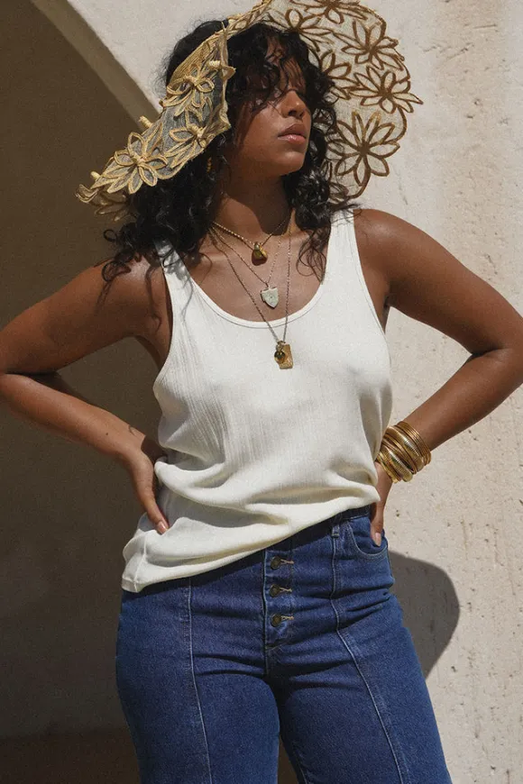 The With The Band Singlet in Whisper White is the perfect blend of comfort and cool. Made from 100% organic cotton, the variegated rib fabric creates a unique texture that feels as good as it looks. The self-fabric bind at the neck and armholes adds a touch of refinement to this laid-back piece. Whether you’re pairing it with jeans, shorts, or a flowy skirt, this singlet is a versatile staple for your wardrobe. Wear it your way and let the effortless style shine through.