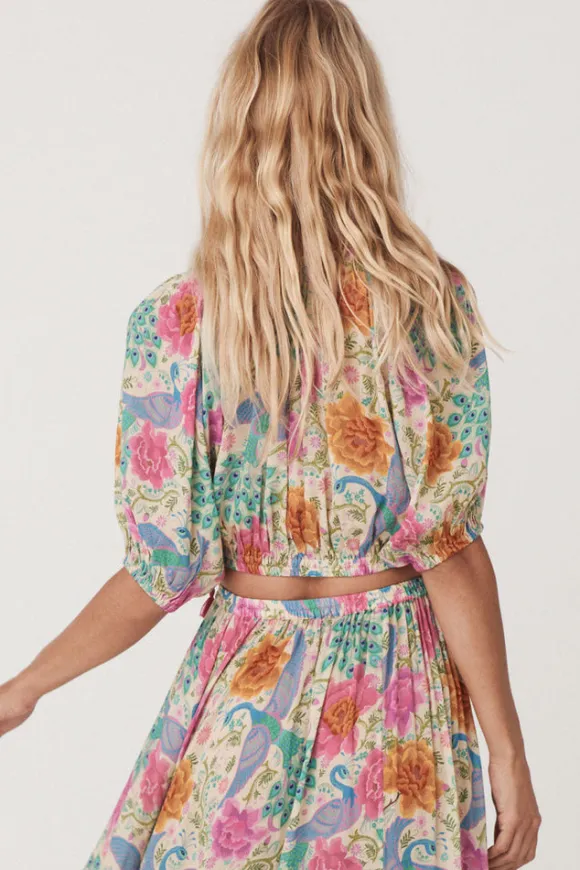The Bohème Cropped Blouse in Spring is reminiscent of our beloved cropped blouse from Folk Song. Fresh and flirty, our crop features our hand drawn Bohème print with peacock and wild bloom motifs coloured in bold pops of pink, turquoise, mustard and purple.