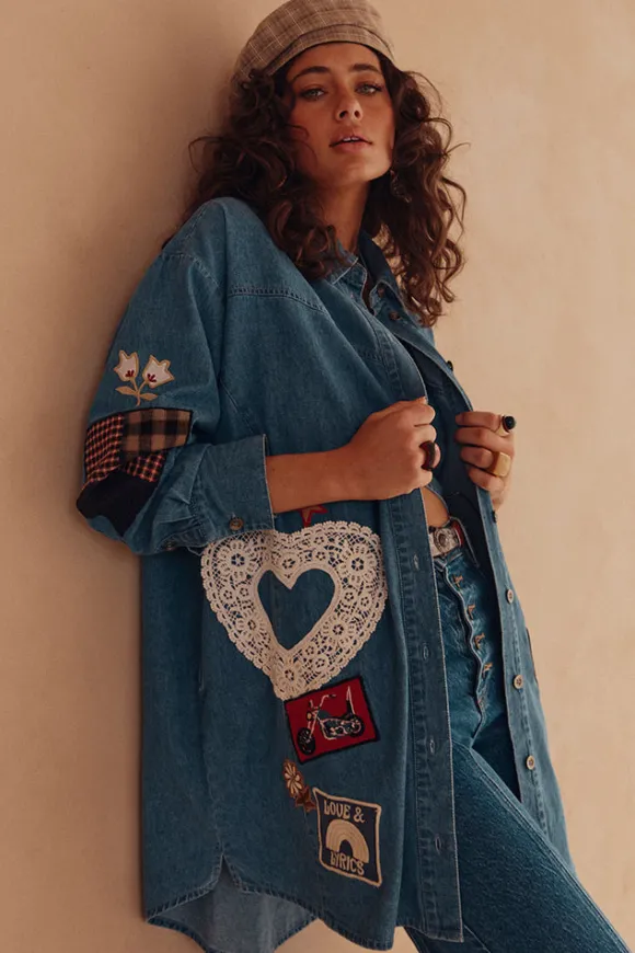 The Bombshell Patchwork Shirt in Chambray is the perfect blend of vintage charm and contemporary edge. With custom patches and a rich mid-tone rigid denim, this shirt exudes a sense of laid-back cool, while antique brass buttons add a touch of retro glamour. Designed with a classic collar, centre front placket, and long sleeves with buttoned cuffs, this shirt is both functional and stylish. The front and back yoke, along with the centre back box pleat detail, add shape and structure to the relaxed fit. Side seam inserted pockets bring a touch of practicality to this statement piece. Pair with your favourite jeans or the Bombshell Skirt for a head-to-toe look.