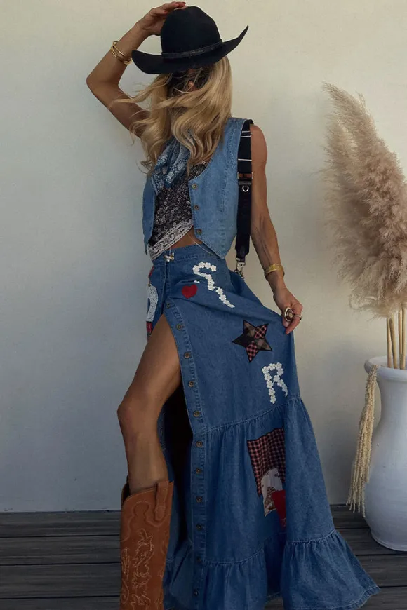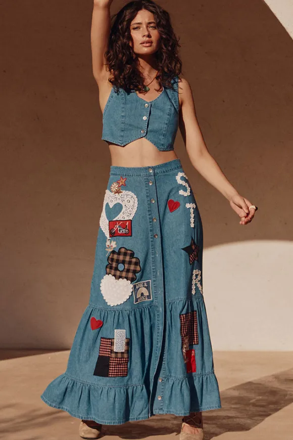 The Bombshell Patchwork Skirt in Chambray is a vintage-inspired dream, blending structured denim with free-spirited charm. Crafted from 100% organic cotton, this tiered maxi skirt features a fitted waist and custom patches for that effortlessly cool, well-loved feel. Antique brass buttons at the center front placket add a touch of nostalgia, making this piece a timeless addition to your wardrobe. Pair it with the matching Bombshell Vest for the ultimate double-denim moment.