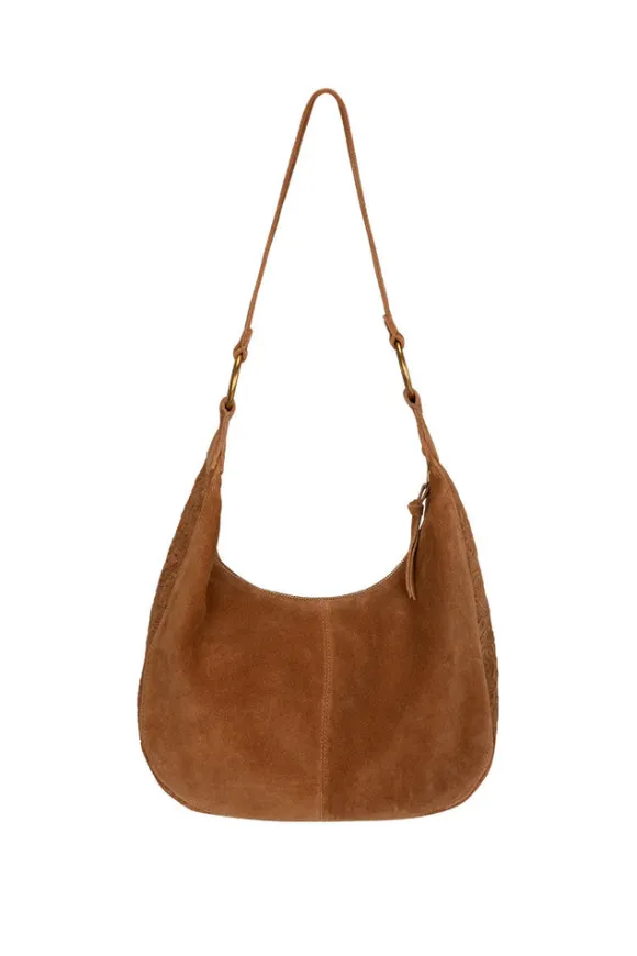 The Clair De Lune Suede Bag in Toffee is a bohemian dream. Crafted for our rockstar muse, our bag is slouchy and oversized with a floral embossed design and antique brass coloured rings and studs.