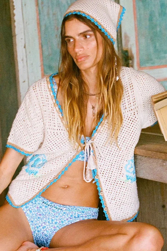 The Coastal Granny Short Sleeve Top in Cornflower is a vintage inspired treasure, crafted for romantic hearts. Hand knitted scalloped edges, bold blue embroidered roses and coconut flower buttons are nostalgic for bygone eras and conjure crochet dreams. An elevated version of the classic Tee, we imagine our top paired with your favourite denim or a lace skirt and boots for effortless everyday charm.
