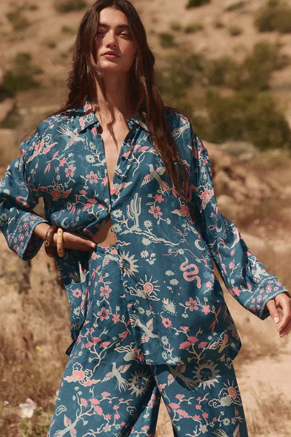 The Desert Bandita Shirt in Cobalt is a statement piece that combines comfort with style. Made from soft, silk-like Jacquard woven fabric adorned with captivating desert motifs in vivid hues, this shirt offers a relaxed yet polished look. Its versatile design allows it to be dressed up or down, making it an essential addition to your wardrobe. Wear it with the matching Desert Bandita Wide Leg Pant for a striking ensemble or pair it with your favorite denim for a chic, casual vibe.