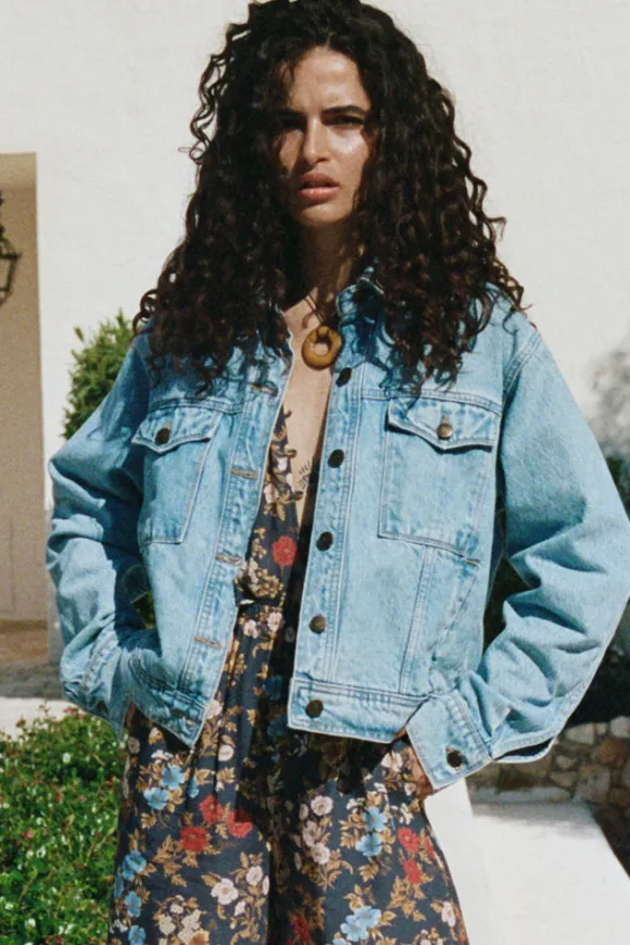 The Eve Denim Jacket arrives in two fabrications and two different colourways. This Jacket exudes effortless ‘cool girl’ in our Sunwashed Blue colourway. A boxy fit in a rigid denim our Jacket is cropped and features side pockets and front pockets with flaps. All brass buttons are Spell branded and completely functional. We see this one paired with our Eve Denim Jeans or the Eve Denim skirt and heels for a ‘relaxed chic’ look. A timeless piece, our Jacket is designed to pair back with all styles from our Flora collection and throughout the seasons for years to come.