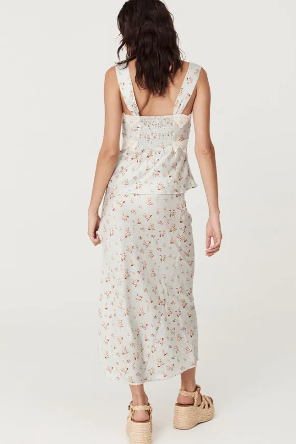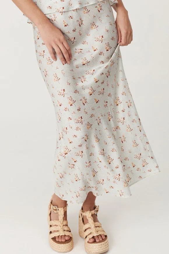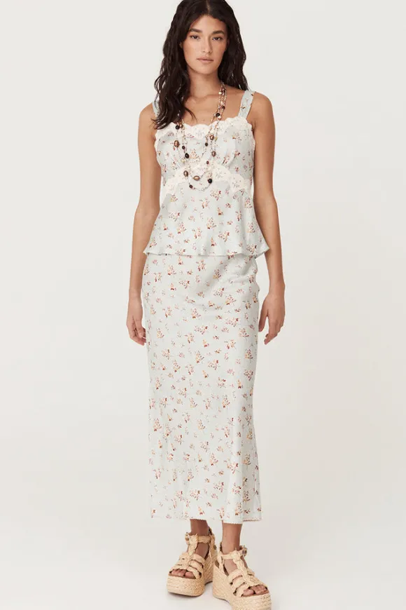 The Fleur Bias Skirt in Teapot Blue arrives as if plucked from a french fairy tale. The bias cut glides over the hips offering a flattering silhouette for the wearer. An elastic waistband with lace trim offers a dreamy allure with the option to wear at the waist or hip for styling versatility. Crafted in a silk like fabrication with an all over ditsy print, our skirt adds a touch of opulence to your fit.