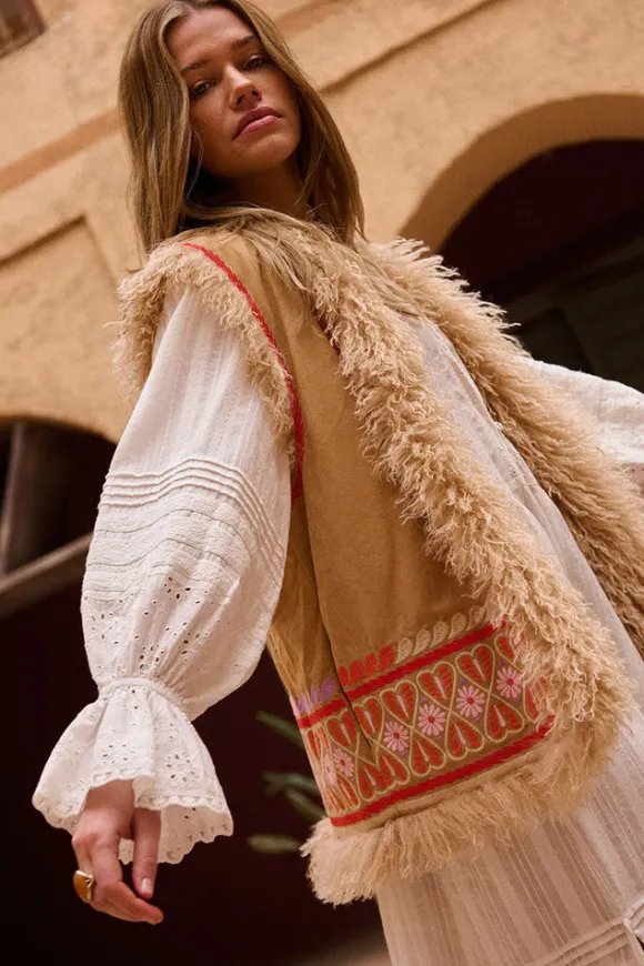 The Full Bloom Embroidered Vest in Daylily is a statement layering piece, designed for the free-spirited muse. Crafted from 100% recycled polyester faux suede and lined with sumptuous faux fur, this vest brings vintage-inspired charm with a modern, conscious twist. Intricate placement embroidery on the back and a bordered hem design add an artisanal touch, making it the perfect blend of effortless cool and bohemian elegance. Featuring side seam pockets and a fully reversible design, you can switch up your look with ease. Throw it over a floaty dress or pair it with bells for that rock-and-roll edge.