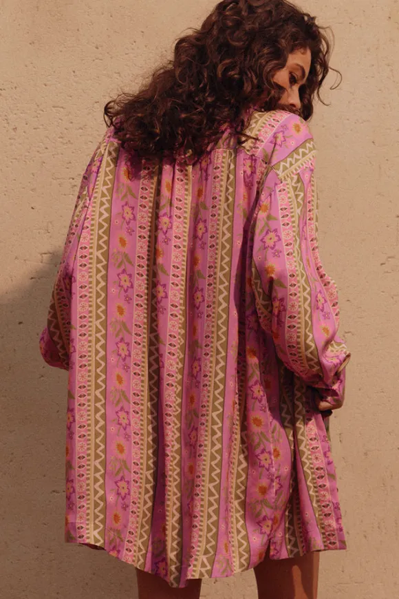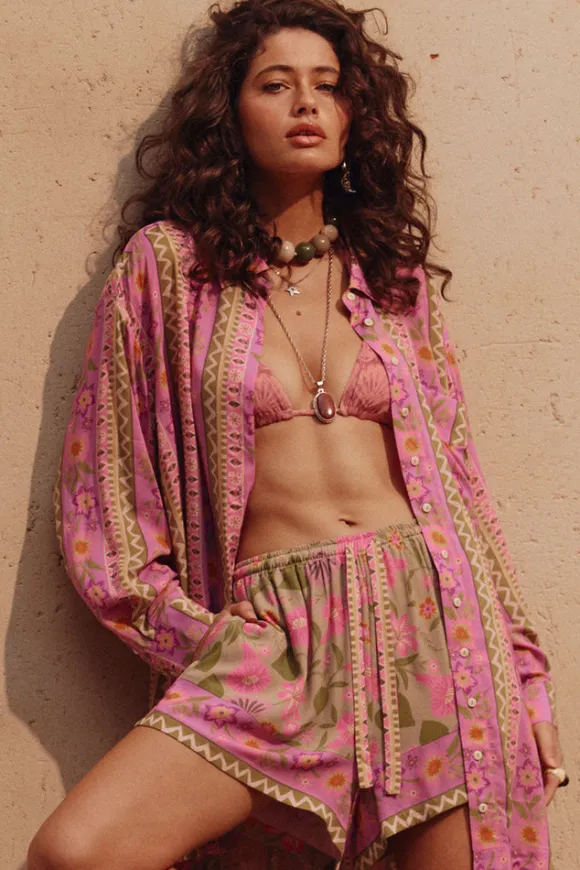 The Goldie Shirt in Desert Rose is an effortless blend of vintage charm and modern ease. Crafted from soft LENZING™ ECOVERO™ Viscose, this relaxed silhouette features an allover print, a classic shirt collar, and a functional button placket with contrast buttons for a hint of intrigue. A chest pocket and buttoned cuffs add timeless details, while subtle hem splits create a flattering drape. Style it open over swim, tucked into denim, or paired with the Goldie Strappy Maxi Dress for a bold print-on-print moment. We can’t wait to see how you wear this beauty!