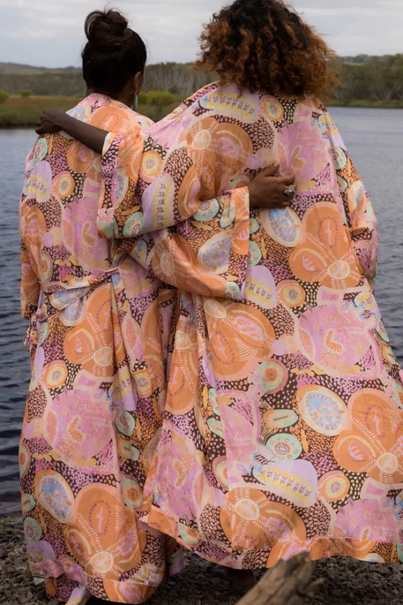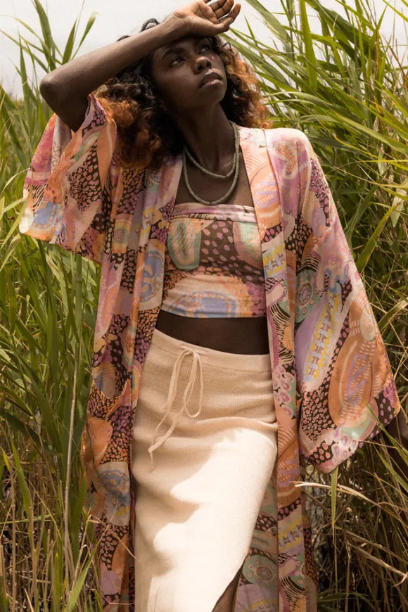 A striking and unique piece, the Kyeoma Koo Maxi Robe in Brown Ochre features a hand painted watercolour artwork from First Nations artist – Kylie Caldwell. A piece of wearable art, a timeless heirloom to be cherished for years to come. A similar shape to our well loved Tyler Robe from Utopia, this Robe features patch pockets, a box sleeve and a detachable tie. Our Robes liquid like fabrication and jacquard weave reveals a secondary print when in just the right light. We recommend pairing with your favourite denim to add some magic to your everyday fit or with any of our Spell X Kylie Caldwell collaboration styles. We know this one won’t last long so get in quick!