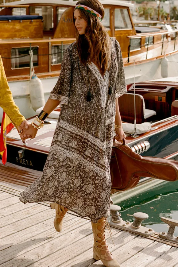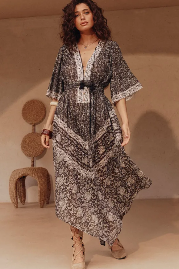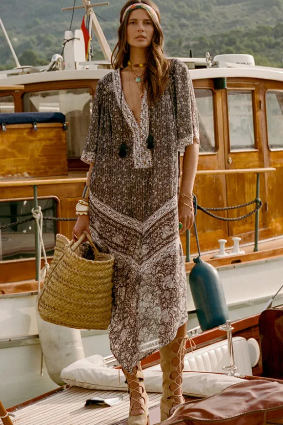 Featuring elbow-length sleeves, a waist tie for a flattering fit, and delicate neck ties with tassel-trimmed ends, this maxi is all about the finer touches. The center-front placket opening enhances its versatility, making it perfect for a daytime soiree or an evening under the stars.