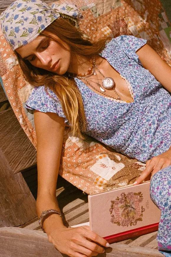 Embrace easy elegance with the Love Jetty Shirred Jumpsuit in Blue Nirvana, designed for both comfort and style. Slip in to this baby with ease with a hidden centre back zipper which with the shirred bodice offers a flattering tailored fit. Flirty flutter sleeves add a playful charm while the dramatic full length wide leg offers an air of sophistication. Featuring an all over ditsy daisy hand drawn print in cornflower blues and a striking rambling rose border detail in deep magentas, our jumpsuit offers dreamy romance for the modern muse. Whether you’re exploring cobbled streets and vintage markets or long lunching with loved ones, this jumpsuit is an instant favourite for any occasion, simply adjust your accessories to elevate or relax this versatile new style.