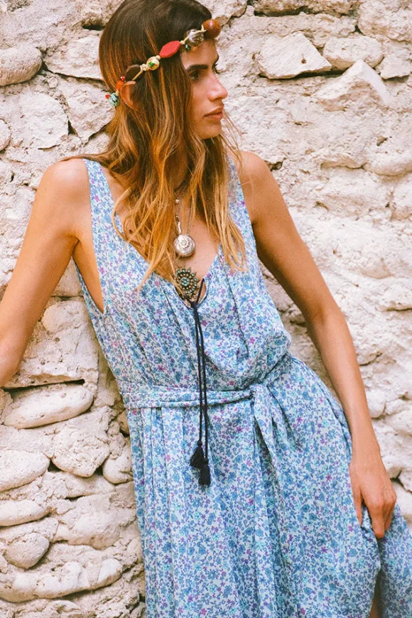 Our Love Jetty Sundress in Blue Nirvana captures the essence of effortless bohemian beauty. With intricate gathers at the neckline and adorning neck ties with tassels, the floaty shape moves with ethereal grace. Featuring an all over painterly ditsy daisy design in ocean blue hues and pops of magenta throughout, our sundress offers sweet romance for the modern muse. This piece can be styled with strappy sandals and fine jewels for a sunset soirée, or toughened up with boots and a chunky belt for a more edgy approach.