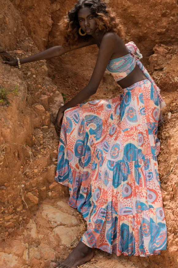 Our Patria Pia Tiered Maxi Skirt in Bay Blue is a voluminous masterpiece. Our newest Maxi Skirt features a hand painted watercolour artwork by First Nations artist – Kylie Caldwell. A similar fit and shape to our Azalea Skirt from Garden Party, this style features dramatic gathered tiers that cascade to the ankles. Pair this one with the Basra Boo Shirt or Evelyn Travel Scarf for a match made in heaven or knotted with a Spell biker tee for a little more edge. We are obsessed!