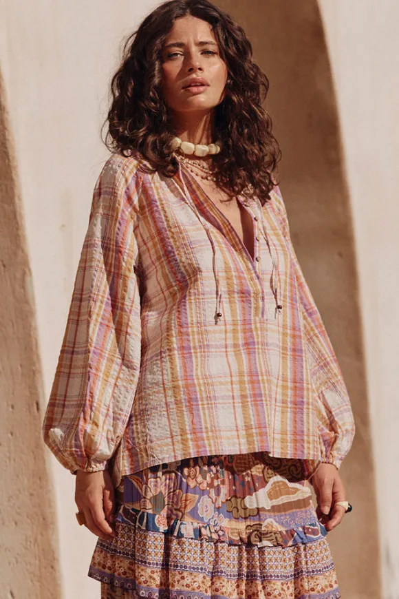 The Patti Blouse in Golden Haze is a vintage-inspired staple, blending effortless charm with a hint of nostalgia. Crafted from 100% organic cotton in a soft yarn-dyed check, this blouse features a relaxed raglan sleeve, delicate neck ties, and bead-trimmed tassel ends for a touch of bohemian elegance. The elastic cuffs add volume and versatility, making it perfect for tucking into your favorite denim or pairing with our matching Patti Pant.