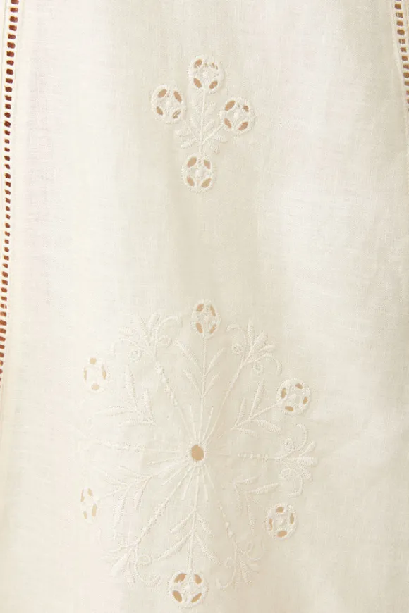 The Pfeiffer Wrap Skirt in Antique Crème is a celebration of intricate design and relaxed sophistication. Crafted from luxe linen, this skirt features large-scale custom embroideries in nostalgic mandala flower motifs, beautifully scalloped lace edges and ladder lace details throughout. The wrap waist and tie allows for an adjustable fit to suit the wearer’s silhouette. This voluminous piece blends hints of antiquity with modern ease, making it a versatile and timeless addition to your collection.