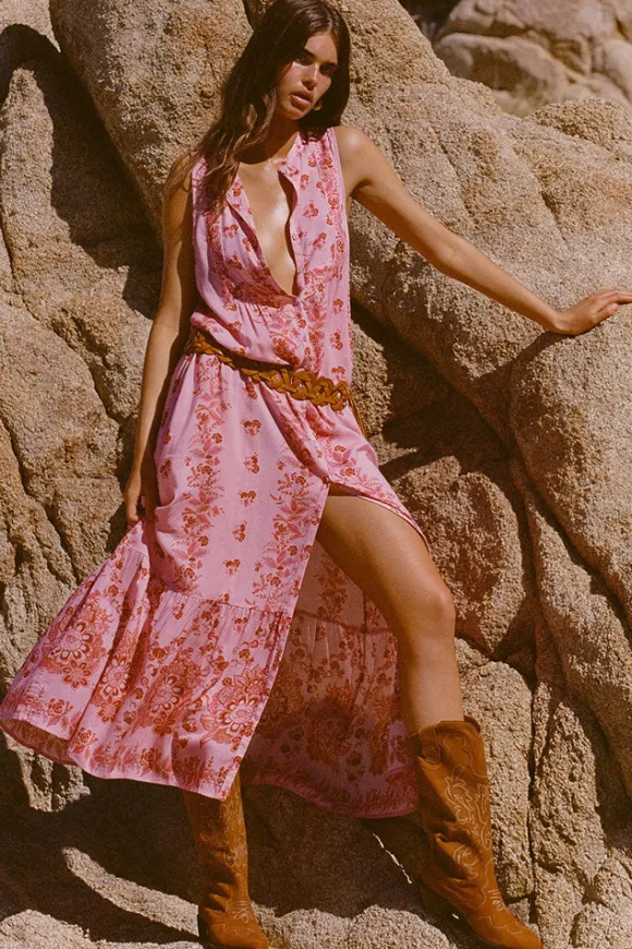 Our Rebel Spirit Button Through Maxi Dress in Zinnia exudes untamed femininity with a rebellious edge. The hand-drawn print showcases wild dahlias and daffodils in vibrant hues with a larger-than-life border print anchoring the design. Cut with extra volume for fluid movement, our dress cascades to the floor for effortless bohemian glamour. Versatile with a button down front and detachable tie, our gown can be styled as a duster over denim and a cami or as a dress with the tie cinched at the waist. We recommend unbuttoning from thigh to hem and pairing with thigh high boots for maximum impact or with a strappy sandal and fine jewels for an elevated affair.