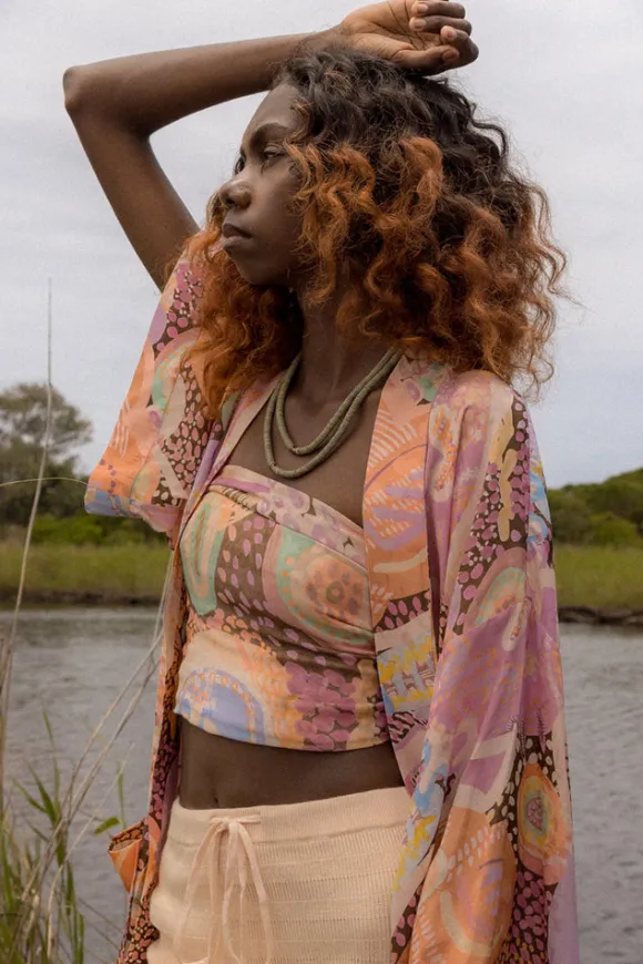 Our Rita Travel Scarf in Brown Ochre is the perfect accessory for all adventures. Our newest Travel Scarf is incredibly unique featuring a hand painted watercolour artwork by First Nations artist – Kylie Caldwell. Our usual Travel Scarf shape, this one is endlessly versatile. Wear this one as a skirt or sarong for easy beach to bar styling, get creative and rock this as a headpiece or as a wrap or halter top. So soft to the touch, our newest scarf makes the perfect gift for yourself or for someone you love.