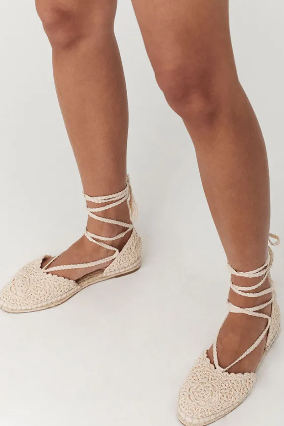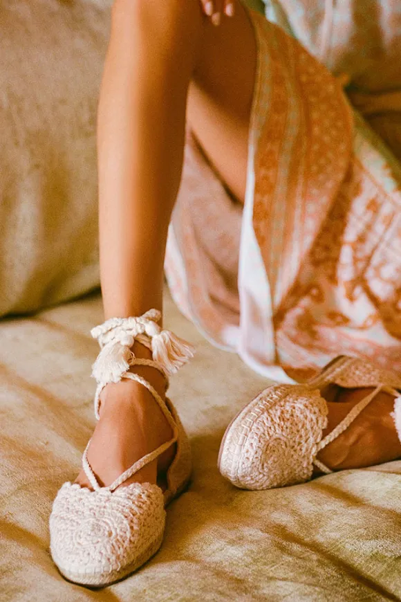 Slip into the Sweet Nothings Crochet Flats in Rope ~ a dreamlike blend of elegance and artisanal charm. These enchanting flats feature a custom hand crochet upper and long delicate ties designed to gracefully wrap around the ankle or wind up the leg, adding a touch of wistful romance to your styling. With a classic espadrille sole and rubber base for durability our newest flats are sophisticated and add a touch of ethereal beauty to any look. We imagine these paired with a lace gown and straw hat for strolling vineyards in far off lands or paired with denim and a cami for a relaxed yet refined take.